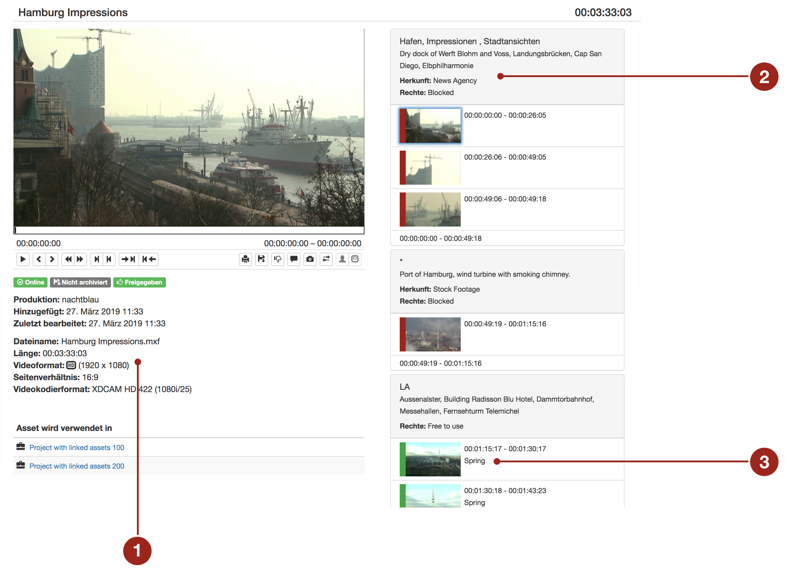 Am Beispiel von Video-Assets lässt sich gut sehen, welche unterschiedlichen Kategorieren von Metadaten es in medialoopster gibt: