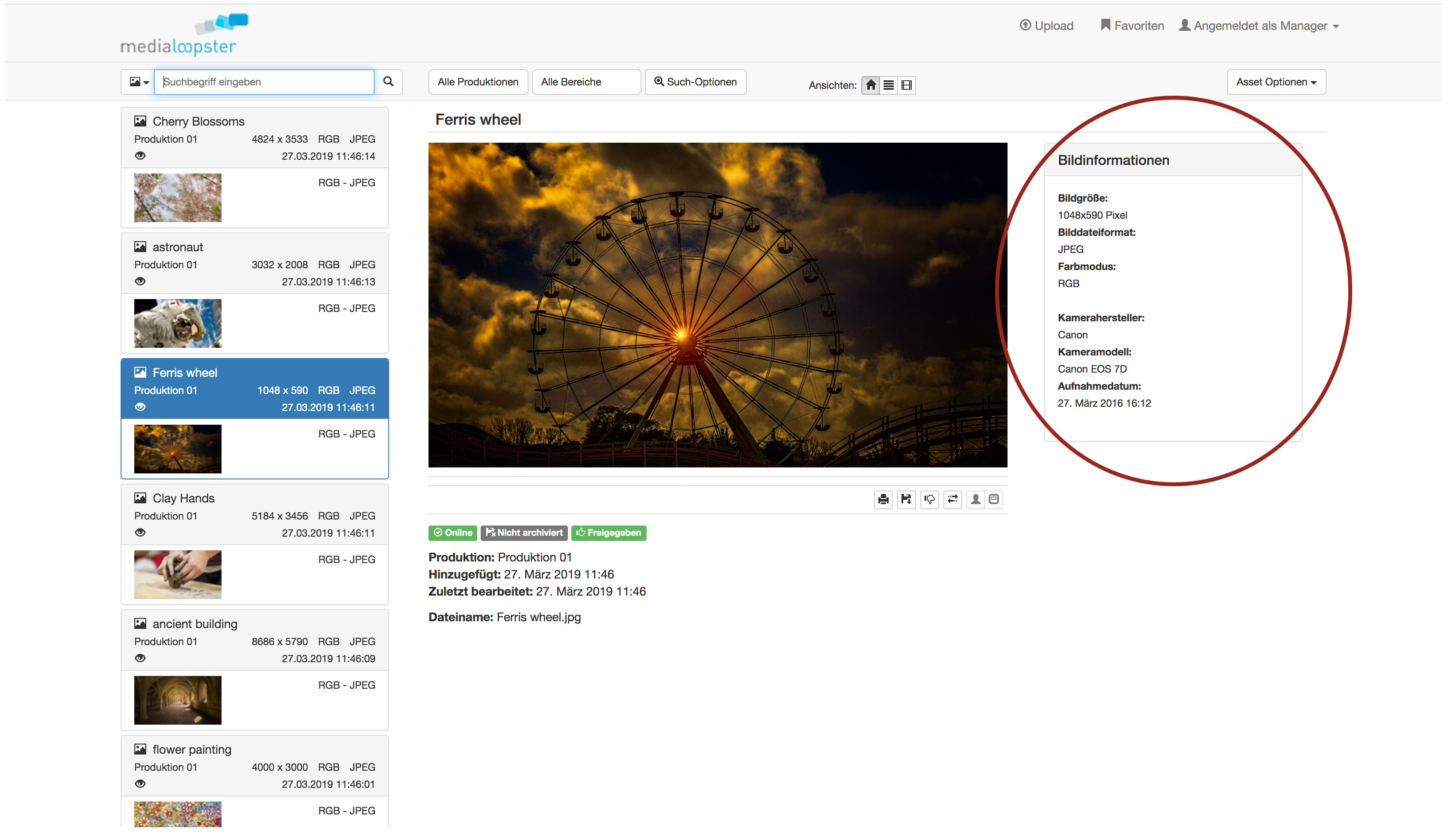 In der Standard-Ansicht sind alle wichtigen Funktionen und Informationen erreichbar. Sie bekommen dort einen schnellen Überblick über Assets und Metadaten.